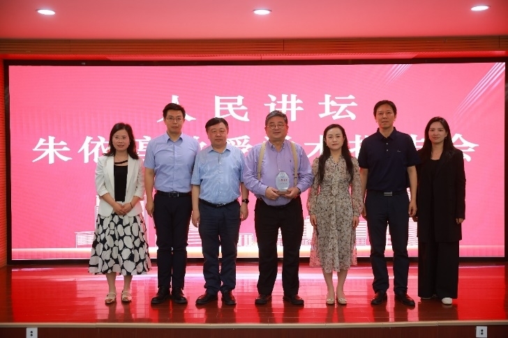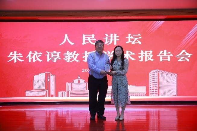 肖璇副院长(右)为朱依谆院士(左)颁发人民讲坛纪念牌