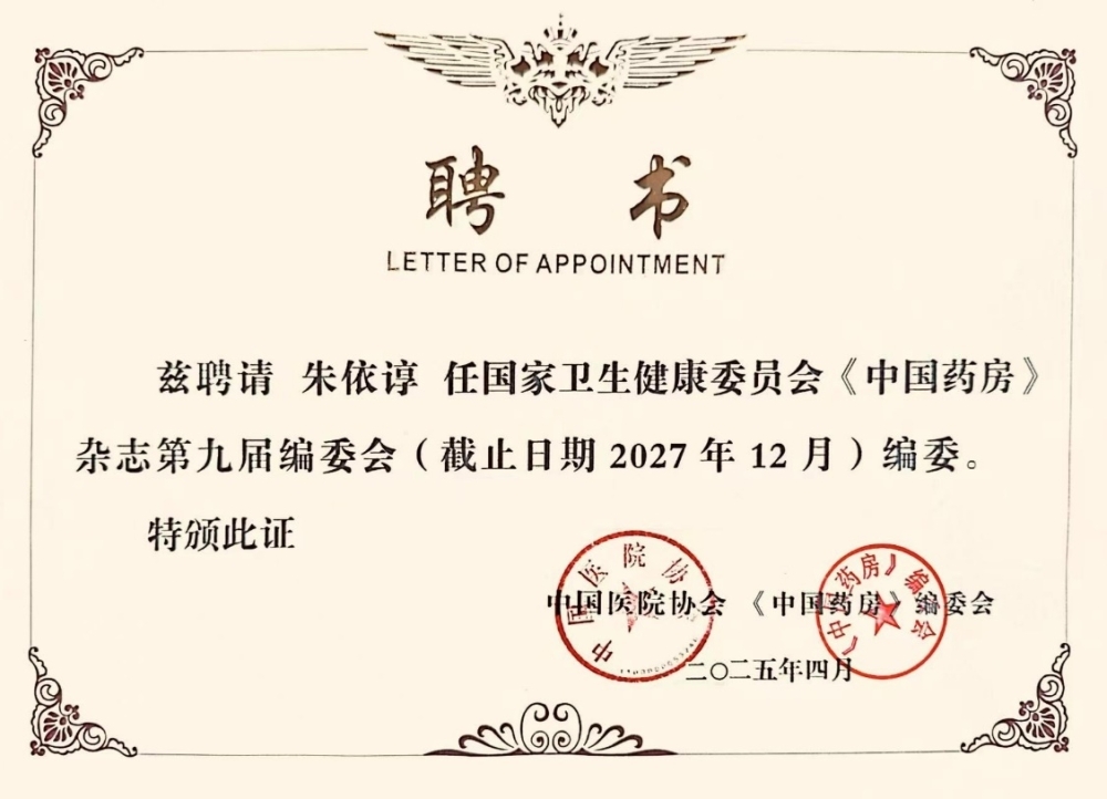 朱依諄院士獲聘擔任《中國藥房》雜誌編委