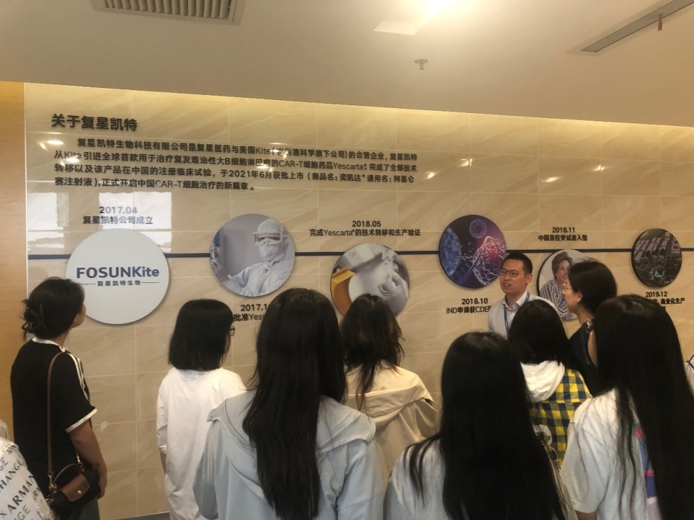 6月6日師生們來到本次實習的壓軸站點——上海復星醫藥(集團)股份有限公司張江園區。師生們首先參觀了復星醫藥科創中心,瞭解到復星醫藥的發展歷程及業務佈局,並參觀了上海復宏漢霖生物技術有限公司研發實驗室,學習大分子生物藥研發和生產的相關知識。隨後,師生們來到了復星凱特生物科技有限公司,詳細的瞭解並學習了細胞治療的基礎知識,以及中國首個獲批准上市的CAR-T細胞治療類產品奕凱達®(阿基侖賽注射液)。至此,2022級藥學實習I圓滿結束,通過本次活動加深了同學們對藥學專業的理解,提高學生的學習興趣。