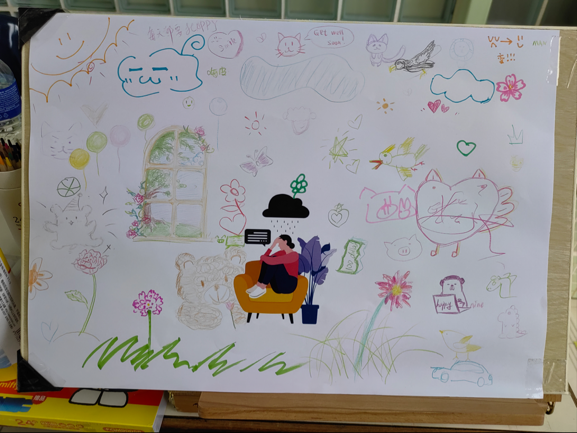 「畫中世界」師生用水彩筆、油畫棒及彩鉛在一副中央有一個陷入抑鬱的小女孩,周圍是一片空白的不完整畫作上,用自己的奇思妙想為女孩點亮色彩斑斕的世界。師生們全神貫注,用色彩安慰著受傷的女孩。