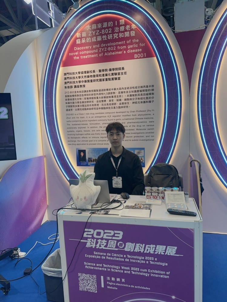 为配合澳门特别行政区科技发展政策的目标,加强对本澳的科研成果宣传推广,提升本地科研成果的知名度,由国家科技部支持,科学技术发展基金主办的“2023科技周暨创科成果展”(科技周)于2023年10月19日-22日成功举办。澳门科技大学协理副校长、医学院-药学院院长、欧洲艺术与科学院院士朱依谆讲座教授的科研成果《大蒜来源的 I 类新药ZYZ-802治疗老年痴呆的成药性研究和开发》受邀参与宣传推广活动。