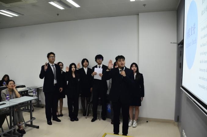 彙報結束後,嘉賓公證全體內閣成員進行宣誓,主席領誓。錚錚誓言,振奮人心。少年不懼歲月長,彼方尚有榮光在,這份誓言也會成為每個成員的一份責任,激勵著每一位同學刻苦努力,持之以恆,以夢為馬,求真務實。