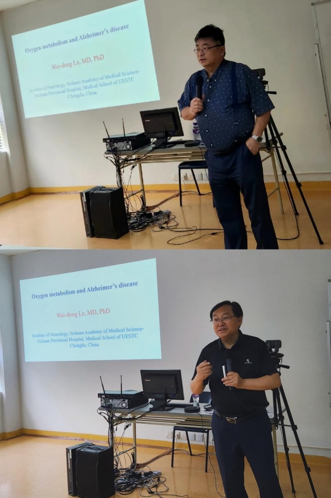 2023年7月30日,现任四川省人民医院学术委员会副主任,神经科学科主任,神经病学研究所所长,电子科技大学医学院学术委员会主任乐卫东教授应邀来药学院为师生们开展了题目为《Oxygen metabolism abnormality and Alzheimer’s diseases》的精彩讲座。首先,朱依谆院长对乐卫东教授的到来表示热烈欢迎。讲座上,乐教授介绍了其对神经退行性病变与神经炎症及生物节律障碍的关系、神经退行性病变与慢性缺氧的相关性以及用高压氧治疗AD等研究。随后乐卫东教授与在场师生就自噬、慢性缺氧在AD中的作用、AD的表观遗传学研究、AD药物治疗潜在靶点的筛选等问题展开了深入讨论。讲座最后,朱依谆院长代表药学院向乐教授赠送纪念品。