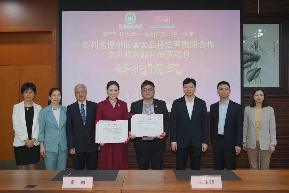 《乳核散結片對乳癖模型大鼠體內藥效及機制研究》技術服務合同簽署儀式在澳門科技大學舉行,由澳門科技大學協理副校長、藥學院院長朱依諄與廣州白雲山中一藥業、奇星藥業總經理寧娜簽署。