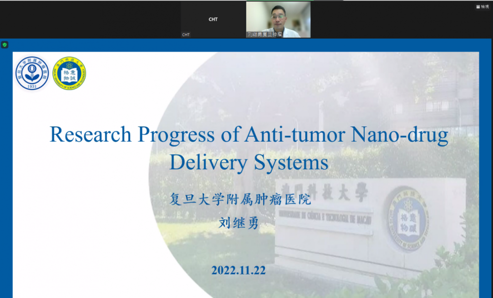 2022年11月22日,复旦大学附属肿瘤医院刘继勇教授为澳门科技大学药学院四年级本科生及博士生开展了题为《抗肿瘤纳米药物递送系统的研究进展》及《Nano-biomimetic Drug Deliver System Theory and Practice》的线上学术讲座。
