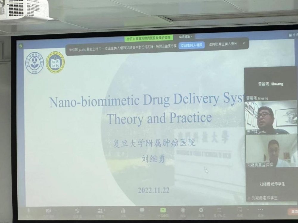 2022年11月22日,復旦大學附屬腫瘤醫院劉繼勇教授為澳門科技大學藥學院四年級本科生及博士生開展了題為《抗腫瘤納米藥物遞送系統的研究進展》及《Nano-biomimetic Drug Deliver System Theory and Practice》的線上學術講座。