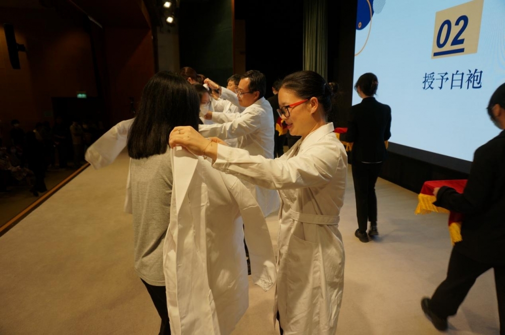 2022年藥學院白袍宣誓儀式於9月26日假D座禮堂順利舉行。本次白袍宣誓儀式首先由李欣志課程主任向大一新生介紹了藥學院的課程體系,以及藥劑師的意義。李老師表示 “我們會默默無聞的工作,會守護患者的用藥健康,保證藥物的使用安全,這是作為藥學人的使命。”