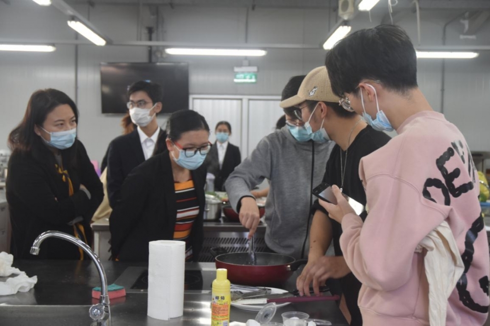 评委对参赛小组的料理制作过程进行交流指导