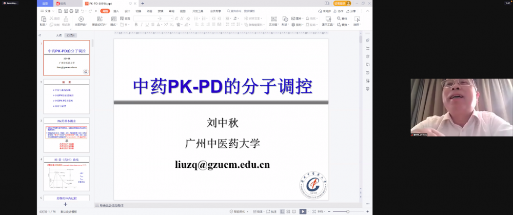 2021年12月10日,广州中医药大学副校长刘中秋教授应邀为药学院的全体研究生进行了题为《中药PK-PD分子调控》的线上教学讲座。本次讲座由药学院课程主任谢莹老师主持。