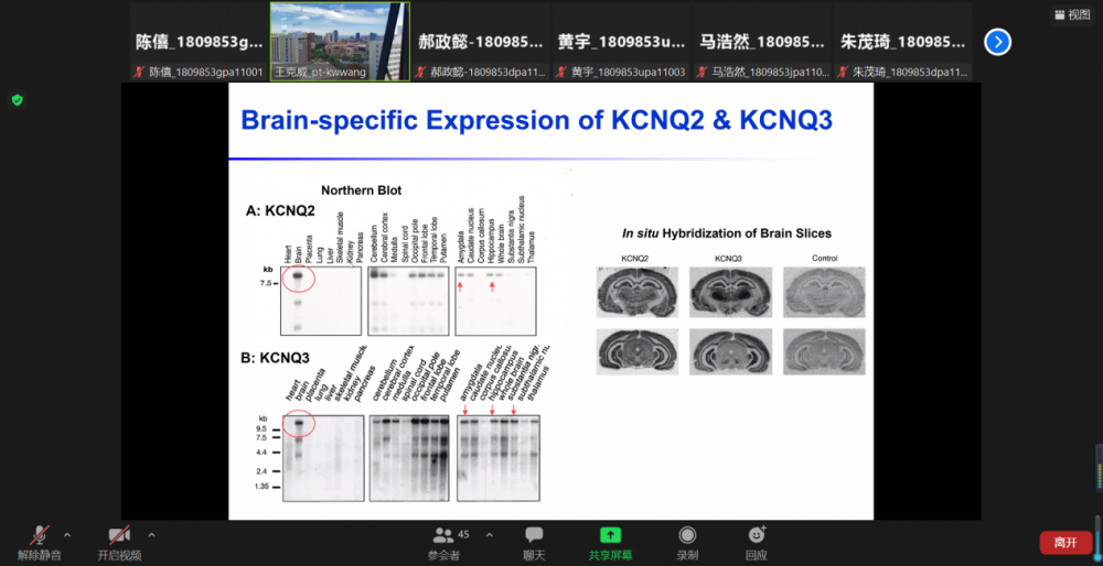 讲座开始,王克威教授先以药物靶标的基础介绍为核心,在与同学们的互动中向同学们讲述了药物靶标的定义、指标、药物靶标的发现与确认和基于靶标的药物研发进展。其中,王教授主要强调生物大分子能成为药物靶标的三大基本条件。随后王克威教授主要针对于配体门控性离子通道(离子通道性受体)、G蛋白偶联受体(代谢性受体)、激酶偶联受体三种药物靶标跨膜转导的机制来进行详细讲述。其中王克威教授将重点放在了离子通道型受体介导的信号传导上,简单介绍了Ca²⁺、K⁺、Na⁺通道的配体关系和离子通道的相关疾病。并以精神分裂症患者为例,介绍了神经元放电机制被破坏下,电压门控钾离子通道 KCNQ 家族在维持细胞兴奋性和离子平衡等生理过程中的重要性。KCNQ2 和 KCNQ3 可形成同源或异源四聚体,是形成神经元M电流的主要分子基础。因此说明KCNQ2 是一个与多种神经疾病相关的重要药物靶点。