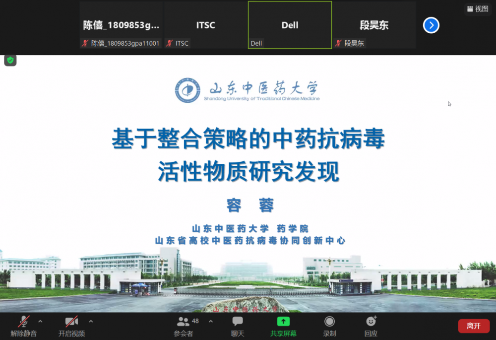 2021年10月18日,由於疫情因素,山東中醫藥大學教授容蓉教授應邀在線上為我院本科學生展開了藥物科學前沿講座,併發表了題為《基於整合策略的中醫藥抗病毒活性物質研究發現》的精彩報告。