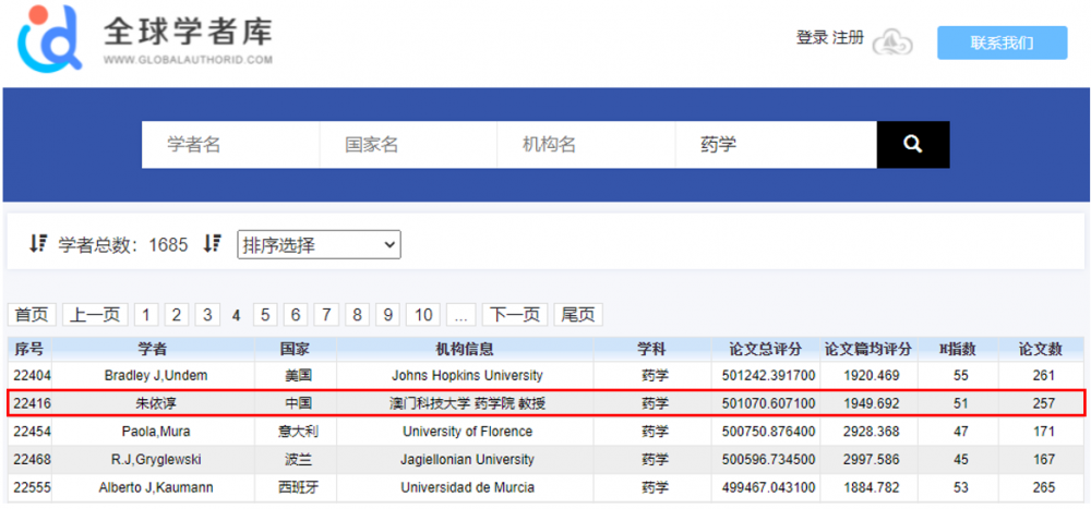 其中,澳门科技大学药学院朱依谆院长以论文总评分501070.6071、论文篇均评分1949.692、H指数51及论文数257入选,在全球顶尖前10万科学家中排名22416,全球药学学科共1685名入围排名302,中国药学学科共177名入围排名12。(资料来源:http://www.globalauthorid.com/WebPortal/EliteOrder)