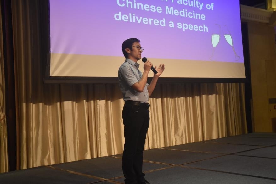 随后,澳门科技大学协理副校长兼国际学院院长孙建荣教授、药学院院长朱依谆讲座教授、中医药学院课程主任徐友华副教授发表致辞,通过祝酒的方式表达对毕业生们的美好祝愿以及对在校生的殷切期望。同时,因公事未能来到现场的中医药学院院长周华教授也以VCR的方式表达了对毕业生们的祝福。