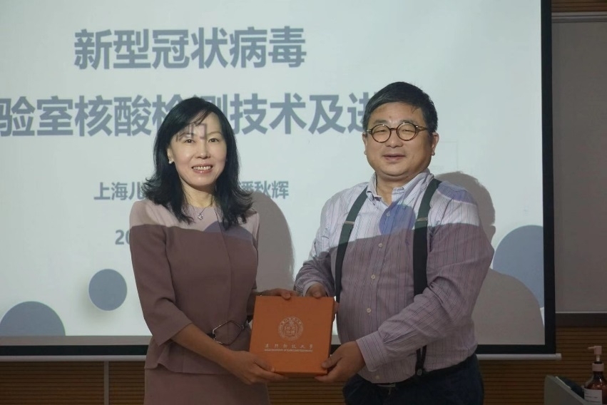 2020年12月7日,上海交通大学医学院附属上海儿童医学中心潘秋辉研究员应邀来我学院参加药学研究进展及药物科学前沿讲座,发表了讲座题目为新型冠状病毒实验室核酸检测技术及进展的精彩演讲。在本次讲座上药学院朱依谆院长代表药学院向潘秋辉研究员赠予纪念品。