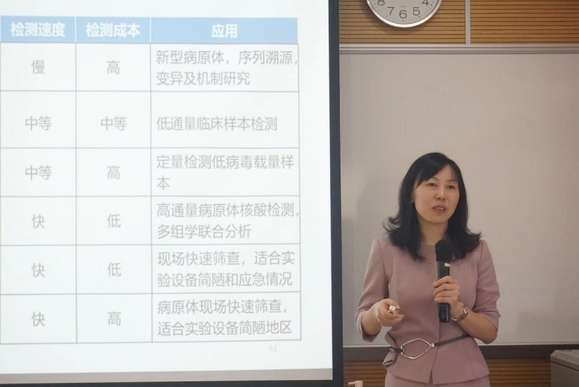 潘秋辉研究员在讲座上概述了新型冠状病毒及实验室诊断和检查,主要介绍核酸检测,恒温扩增技术,Cas酶的检查技术,MALDI-TOF MS检测,生物传感器检测。另外还拓展介绍了PCR+萤光探针技术,巢式PCR+基因芯片技术,LAMP+基因芯片技术,LAMP+CRISPR技术,CPA+萤光探针技术,TMA+萤光探针技术,TMA+金探针技术,TMA+生物素标记探针技术,DNA探针技术,联合探针猫定聚合测序法。在讲座中潘秋辉研究员还探讨了核酸检测的趋势和国内外新冠核酸POCT平台的发展,并对核酸检测结果进行解读。