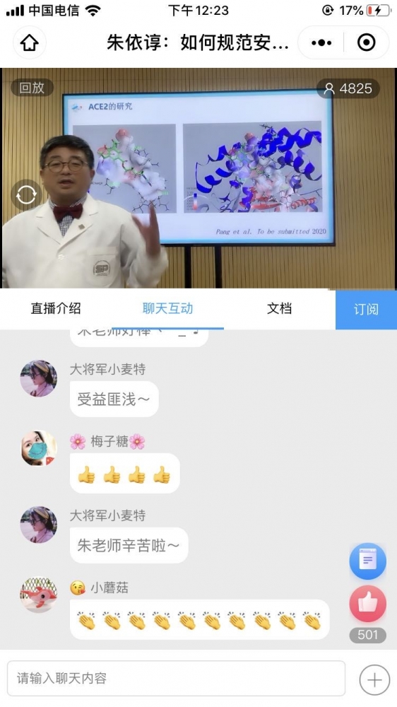 2020年5月4日,药学院院长朱依谆讲座教授受邀请参加了此百名大咖线上直播讲堂活动,讲堂主题「如何规范安全用药到欧美最新研发药物」,线上近5,000师生共同通过网络参与了本次讲堂并开展热烈讨论。