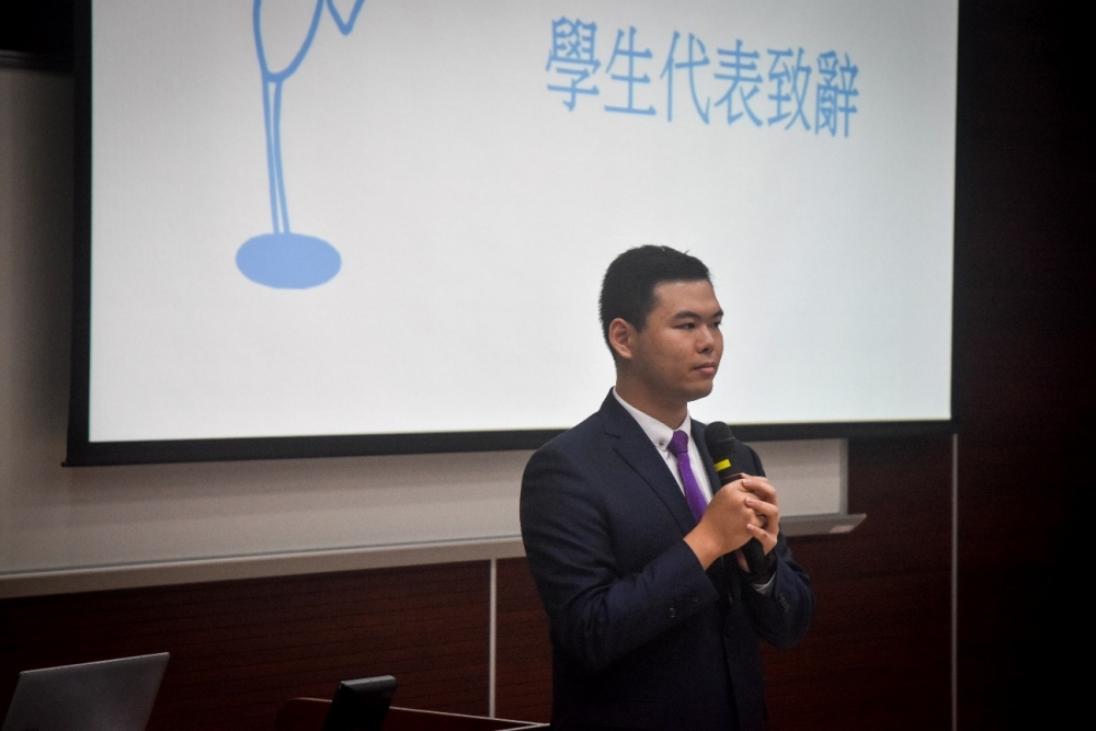 隨後澳門科技大學藥學院學生會會長郭靖宇向同學們介紹了藥學院學生會內閣成員,希望藥學院新生加入學生會為藥學院同學的福祉與權益而努力。同時期望藥學院同學們勇敢拼搏,找到目標,耕耘自己的美好未來。