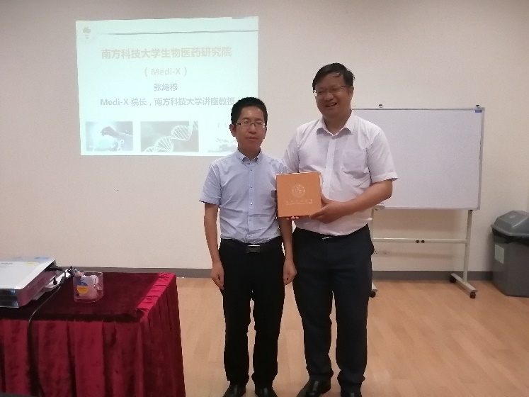2019年8月12日,南方科技大学生物医药研究院张绪穆教授来访澳门科技大学,做了题为《药物绿色合成》的演讲,并由中药质量研究国家重点实验室姚小军教授向张绪穆教授赠送纪念品。