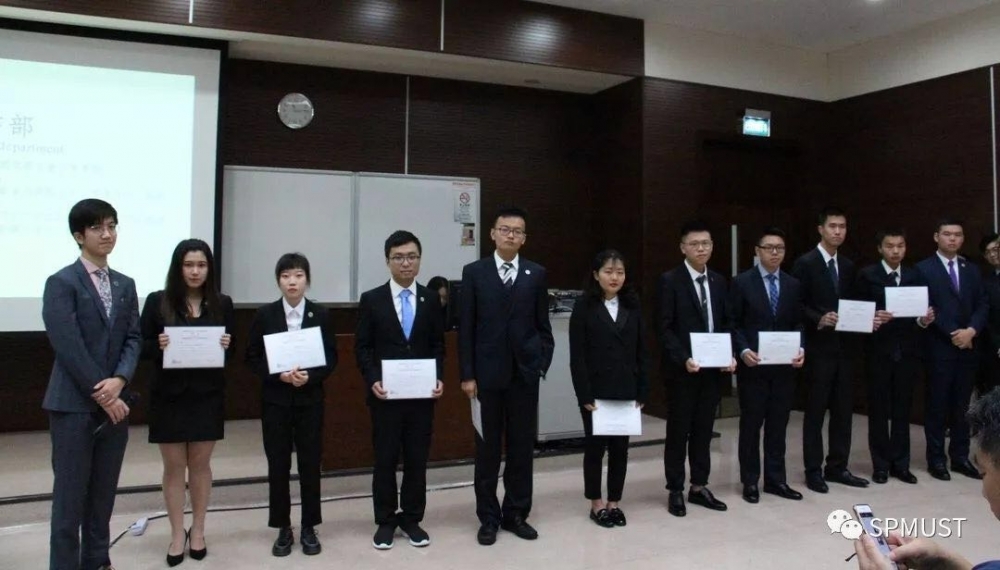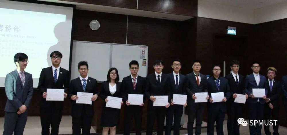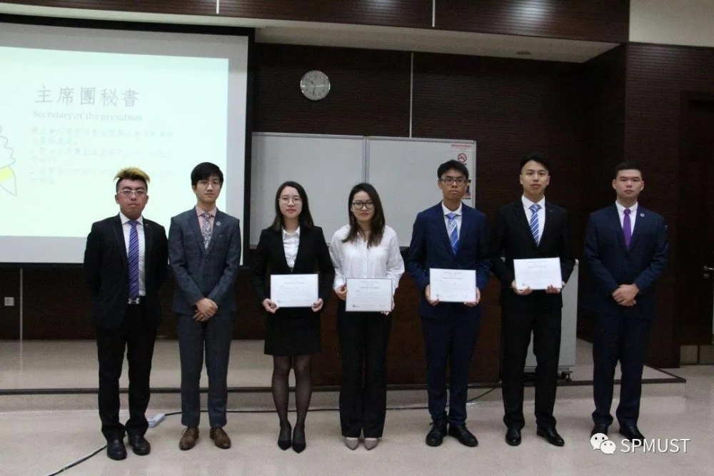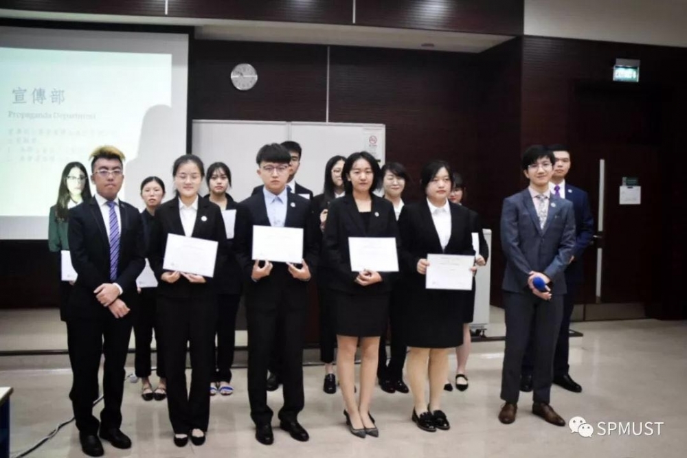 大会第三部分,由公关部干事分别引导各部门部长、干事上台进行互动颁发证书前各部门部长介绍本部门职能,其馀成员自我介绍。随后主席及副主席颁发证书并合影留念主席团秘书合影。