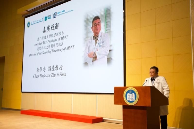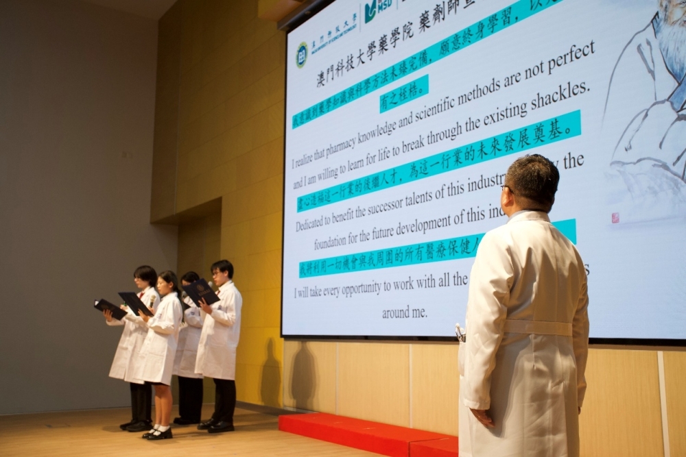 2025年9月18日,澳門科技大學醫學院藥學院於N座禮堂隆重舉行2025級藥學學士學位新生白袍加身宣誓儀式。七十餘位新生在師長的見證下,身穿象徵專業與使命的白袍,以堅定的誓言表達投身藥學事業的決心,許下守護人民健康的莊嚴承諾。出席嘉賓包括:澳門科技大學協理副校長、醫學院藥學院院長朱依諄院士,藥學院課程主任葉麗教授,課程主任李欣志助理教授,以及多位教師和研究人員代表。