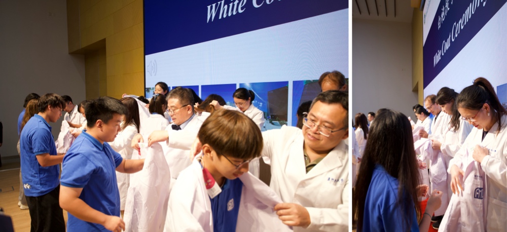 緊接著,在朱院長等教師代表的帶領下,向全體新生授予象徵職業使命的白袍,標誌著藥學生涯的正式啟航。白袍加身後,在朱院長與四位班長的帶領下,在台下的教師、研究人員代表的見證下,全體藥學學士學位新生莊嚴宣誓,許下投身藥學事業、恪守專業倫理的鄭重承諾。