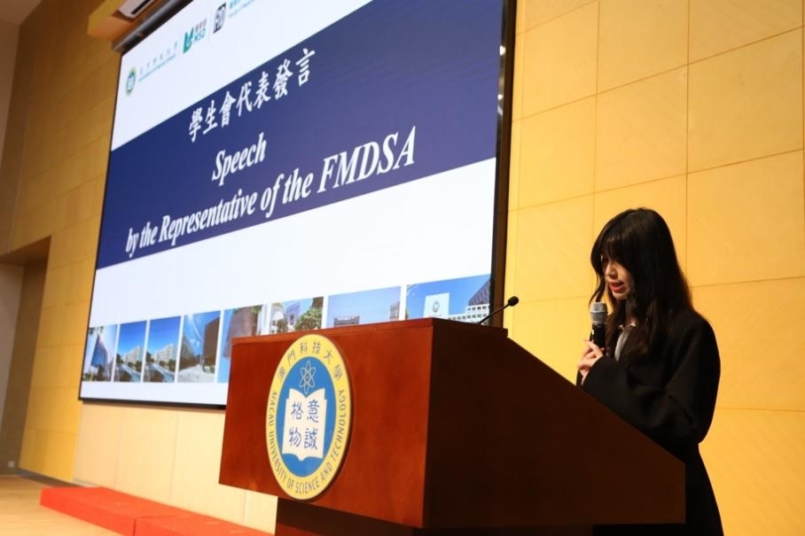新生代表李佳逸同學分享了她選擇藥學專業的初心與理想,以及對澳門科技大學的信任與期待。她將藥學視為融匯科學理性與人文溫情的橋樑,並承諾將從紮實專業基礎、勇於創新探索、銘記職業責任三個方面不斷努力,立志成為一名“有根基、敢創新、有擔當”的藥學人,以實際行動踐行“健康所系,性命相托”的誓言。她的分享可歸納為四大關鍵詞:初心、熱愛、承諾與擔當。